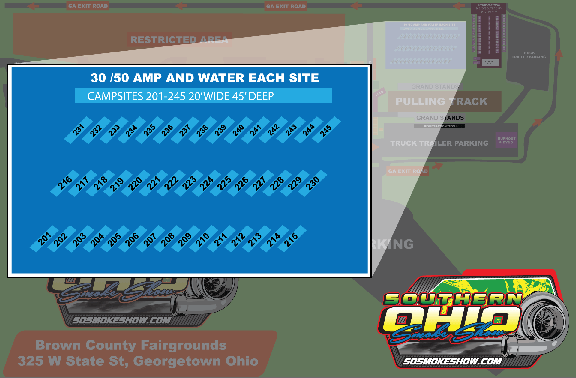 Why leave when the action's just getting started? Set up camp right on the Brown County Fairgrounds and make the most of your SOSS weekend. With only 45 spots available, you'll want to reserve yours early.